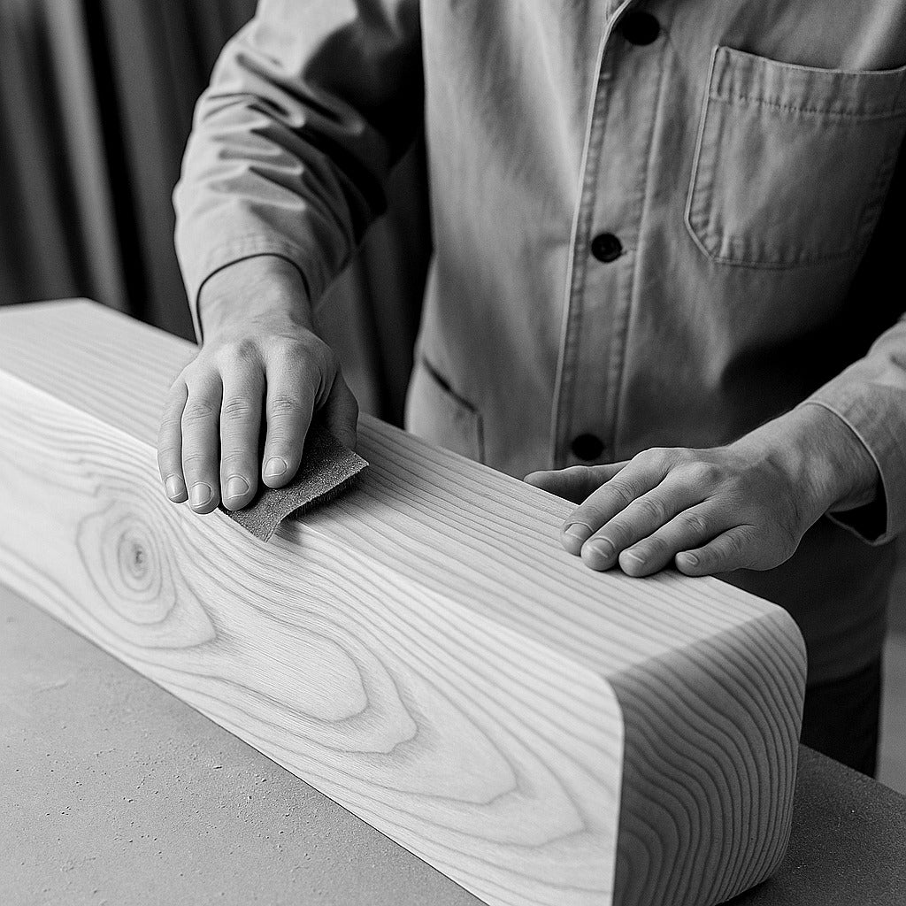 ・木目の出方や色の濃淡が一点一点異なる・削り出しの曲線や断面の仕上げに温かみがある・合板やプリント化粧板にはない“生きている質感”